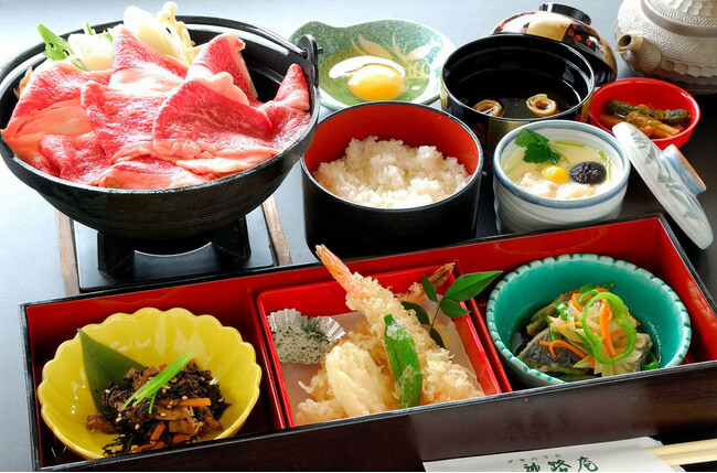 松阪牛鍋、 天婦羅、 茶碗蒸、 季節の小鉢二品、 御飯、 汁物、香物