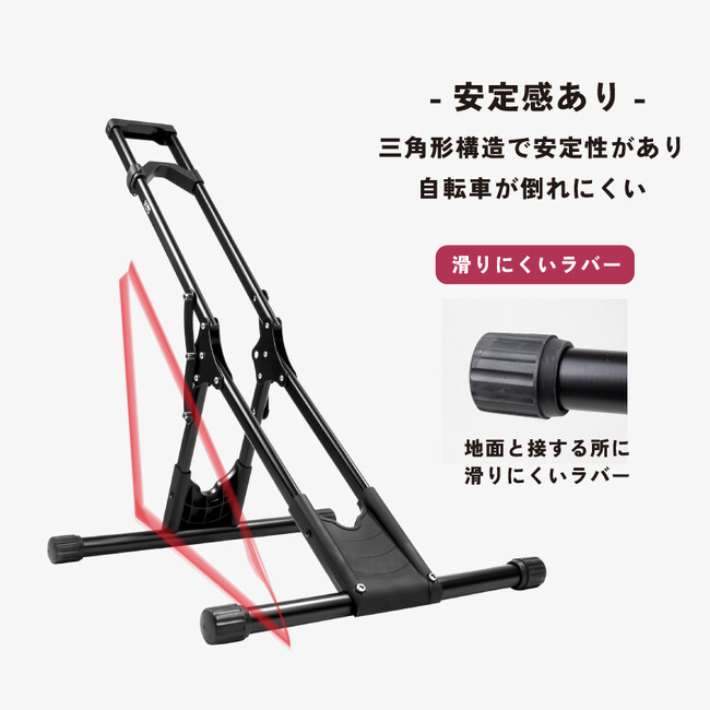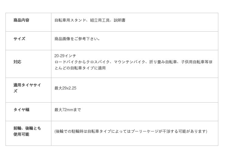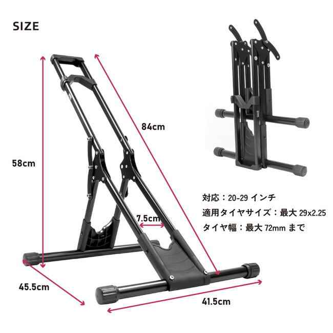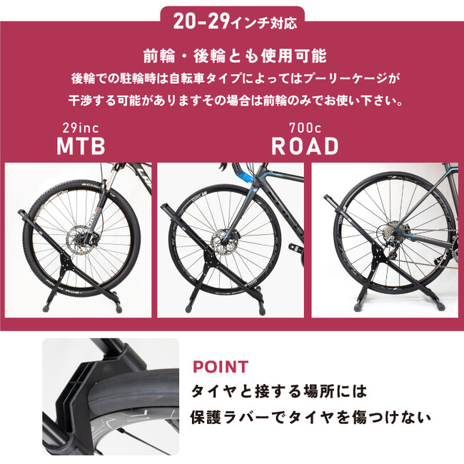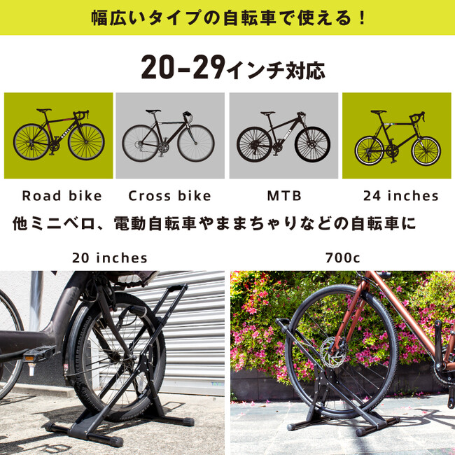 スライドして様々な自転車に合わせる20-29インチまで対応する自転車スタンドです。ロードバイクからクロスバイクやMTB、ピスト、BMX、小径車、子供用自転車、電動自転車など様々な自転車に最適です。