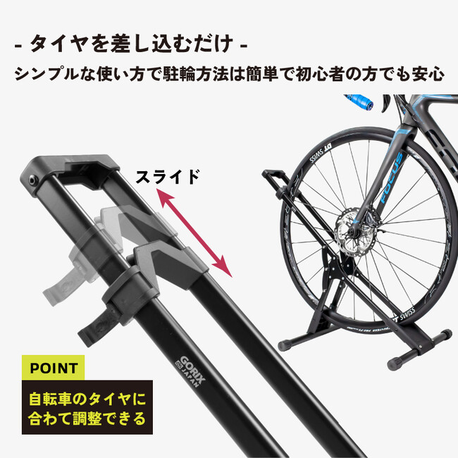 使い方はとても簡単でタイヤを差し込みスライドでホイールサイズに合わせて駐輪完了です。