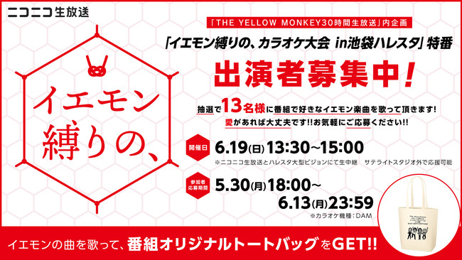 ※「イエモン縛りの、カラオケ大会 in池袋ハレスタ」企画は6月19日(日)13時30分~15時に生配信される予定です。