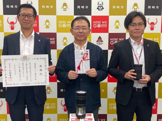 損害保険ジャパン株式会社(代表取締役社長:石川 耕治、以下「損保ジャパン」)は、愛知県岡崎市(市長:中根 康浩)と締結した「包括連携協定」に基づき、災害用備蓄品として「ハイパワー2WAYランタンライト(620点)」を贈呈しました。