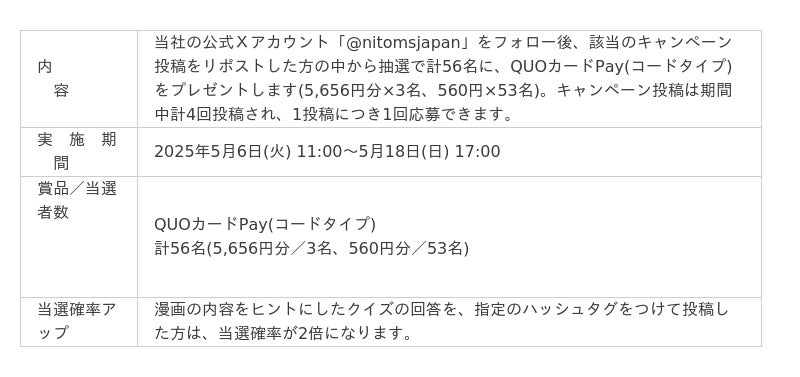 当社の公式Xアカウント「@nitomsjapan」をフォローし、『コロコロ』をテーマとした漫画を掲載したキャンペーン投稿をリポストした方の中から、抽選で計56名に、QUOカードPay(コードタイプ)をプレゼントします(5,656円分×3名、560円×53名)。さらに、漫画の内容をヒントにしたクイズの回答を、指定のハッシュタグをつけて投稿した方は、当選確率が2倍になります。