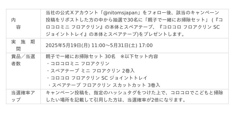 当社の公式Xアカウント「@nitomsjapan」をフォローし、該当のキャンペーン投稿をリポストした方の中から、抽選で30名に、「親子で一緒にお掃除セット」(『コロコロミニ フロアクリン』の本体とスペアテープ、『コロコロ フロアクリン SC ジョイントトレイ』の本体とスペアテープ)をプレゼントします。さらに、キャンペーン投稿に指定のハッシュタグをつけた上で、コロコロでこどもと掃除したい場所を記載して引用した方は、当選確率が2倍になります。