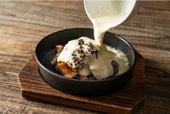 トムフレッシュ、モッツアレラ、グリュイエール、モントレージャック、ホワイトチェダーの5種のチーズを、地鶏にベストマッチなバランスのソースに仕立てました。ジュウジュウと音を立てる炭火焼の上に、スタッフが卓上でチーズソースを回しかけます。