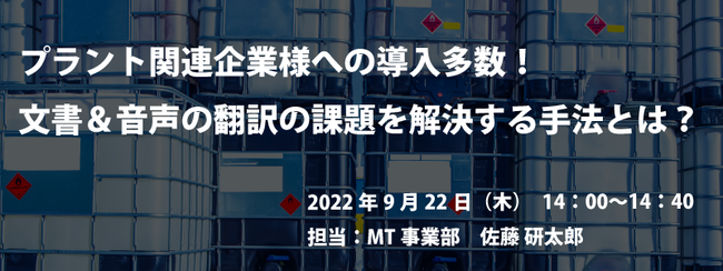高精度AI自動翻訳の開発・運営を行う株式会社ロゼッタ(本社:東京都千代田区 代表取締役:渡邊 麻呂)は、無料ウェビナー『プラント関連企業様への導入多数!文書&音声の翻訳の課題を解決する手法とは?』を2022年9月22日(木) に開催いたします。