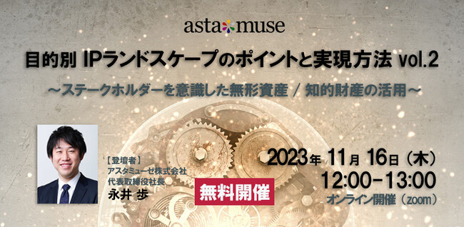 アスタミューゼ株式会社(本社:東京都千代田区、代表取締役社長 永井歩)は、2023年11月16日(木)12:00-13:00に、事業会社の知財担当者、R&D部門の方々を対象とした無料ウェビナー「目的別 IPランドスケープのポイントと実現方法 vol.2 ~ステークホルダーを意識した無形資産/知的財産の活用~」を開催いたします。過去複数回実施し累計1,500名以上のかたに参加いただいた「目的別IPランドスケープのポイントと実現方法 ~各部門に理解され、経営・事業判断に使えるものとは~」の続編となり、2023年6月以来の約5か月ぶりの再開催となります。
