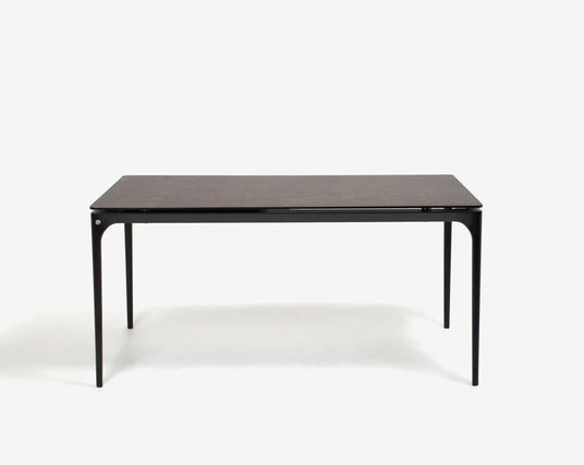 洗練されたモダンデザインが魅力の、伸長式ダイニングテーブル。天板には、熱や傷に強く、日常使いにも適したセラミックガラスを採用。脚を引き出し、収納されている天板を広げるだけの簡単操作で、テーブルの幅を220cmまで変更することができます。来客時など、必要に応じてゆとりあるダイニングスペースを確保できます。