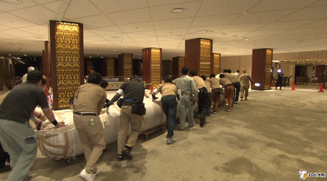 この巨大な物を使って、32名もの職人さんがホテルの大改修を行います。その8時間にも及ぶ戦いに密着!