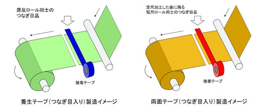 こうして仕上がった両商品には、1巻あたり1ヶ所つなぎ目部分が含まれるものとなりました。この“つなぎ目”は糊残り、糊が薄い部分が発生する可能性があり商品の特性が保証できないため、対象部分を一目で判別できるよう使用できる部分とは異なる色のテープで可視化し、使用不可である旨を商品のパッケージ上で訴求しています。