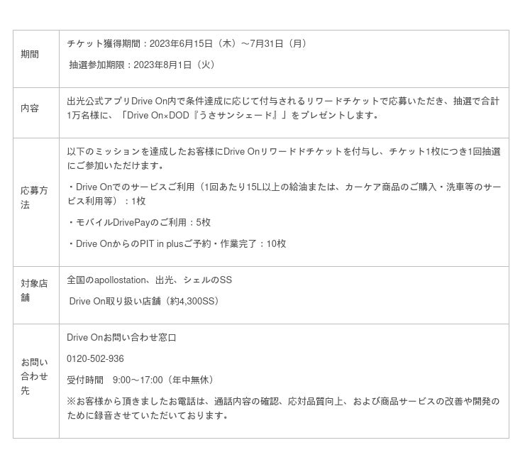 出光興産株式会社(本社:東京都千代田区、代表取締役社長:木藤俊一、以下:出光)は、 ビーズ株式会社(本社:大阪府東大阪市、代表取締役社長:大上響)が展開するキャンプ用品 ブランド「DOD(ディーオーディー)」とのコラボレーションで、抽選で1万名様にDOD× Drive Onオリジナルグッズが当たる「DOD×Drive On『うさサンシェード』プレゼントキャンペーン!」を開催します。本キャンペーンは、全国のapollostation、出光、シェルのサービスステーション(以下:SS)のDrive On取り扱い店舗にて、2023年6月15日から7月31日まで開催予定です。