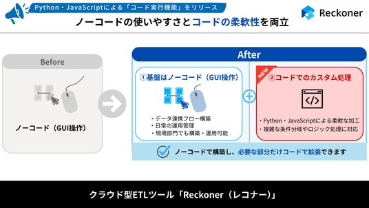 「Reckoner」ではこれまで、ノーコードのGUI操作により、非エンジニアでも扱いやすいデータ連携環境を提供してきました。
