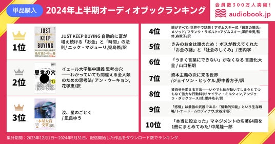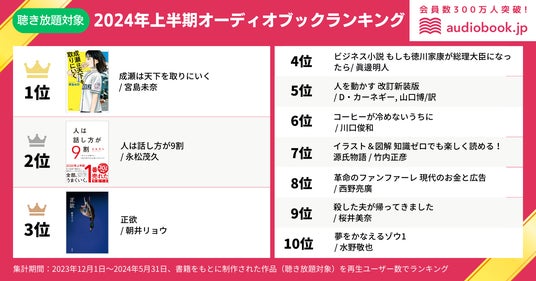 株式会社オトバンク( 本社:東京都文京区、代表取締役社長:久保田裕也、以下「オトバンク」)は、当社が運営する会員数300万人超、オーディオブック書籍ラインナップ数No.1(※)のオーディオブック配信サービス「audiobook.jp(オーディオブックジェイピー)」における、2024年 上半期(2023年12月1日~2024年5月31日)のオーディオブックランキングトップ10を発表します。