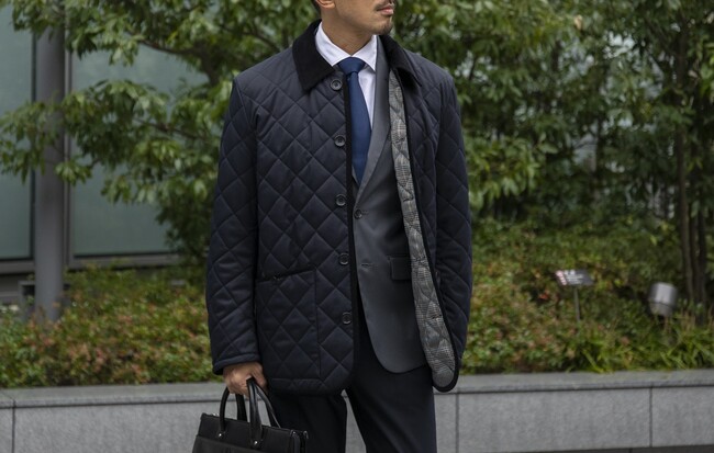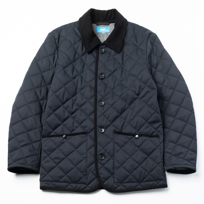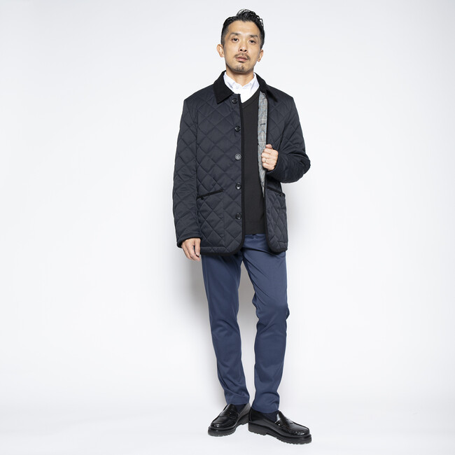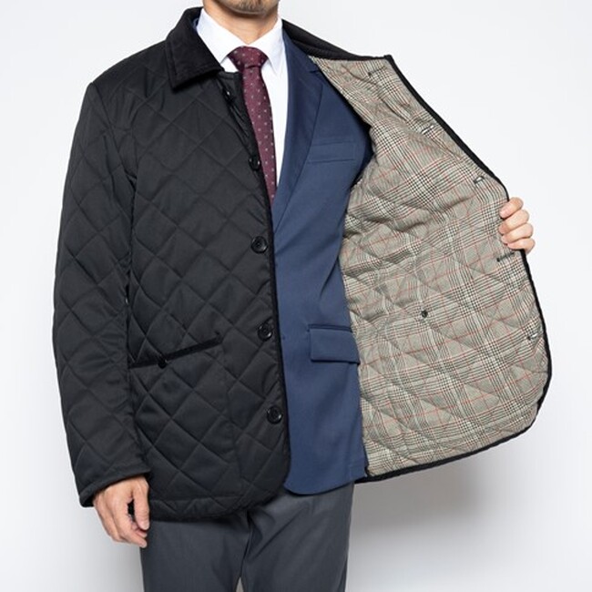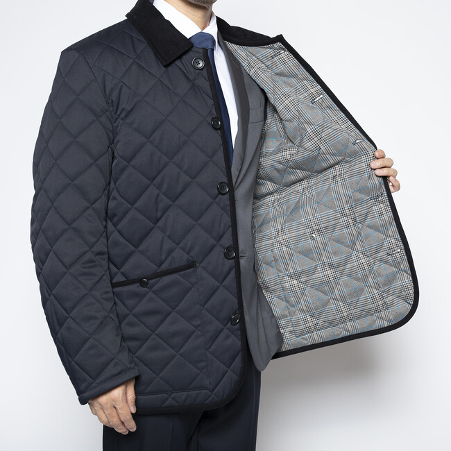 特徴:定番のダイヤモンドキルティングジャケット。表生地に、速乾・撥水・ストレッチ・防シワ・耐久性などの機能を備える自社オリジナル素材「ultimex」を使用。中綿は再生繊維を使用した環境にやさしい素材である「サーモライト(R)エコメイド中綿」を使用し、軽量かつ優れた保温性を実現しました。襟とトリムにコーデュロイ生地、裏側に表地と異なる素材感のグレンチェックを使用し、シンプルながらにギミックのあるデザインに仕上げました。スーツスタイルやニットなどの上から羽織っても着膨れを気にせずご着用いただけます。