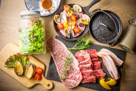 グランピングならではの厳選BBQ食材の数々。地産地消にこだわり、広島エリア・安芸太田町の名産を取り入れ、普段とは異なるグランピングBBQをお召し上がりいただけます。