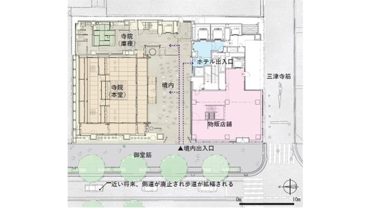 ・ 寺院の上部にホテルを配置し高度利用するとともに、寺院の来訪者だけでなく、ホテル利用者も境内を通り、ホテルロビーにアクセスする動線とする等、寺院とホテルを物理的にも一体的な空間として整備。
