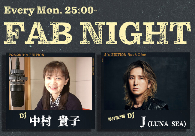 毎週月曜日25時から中村貴子が毎週豪華なアーティストを招いて、MUSIC FAB(モノづくり)な 話をFAB(愉快)なテンションで楽しめる番組『FAB NIGHT』!さらに、毎月第2月曜日はJ (LUNA SEA)も登場する「J's EDITION Rock Line」。中村貴子とJ (LUNA SEA)が熱い夜をお届けします。