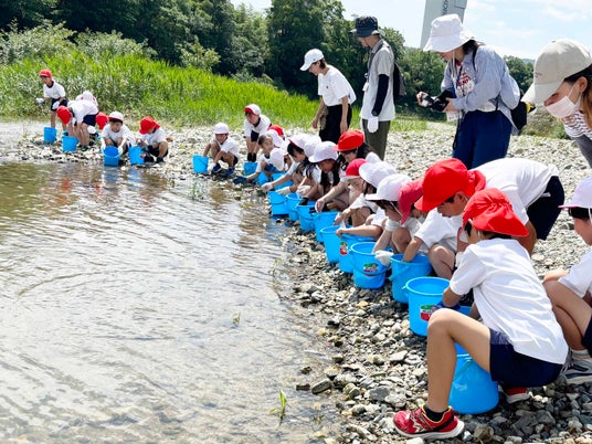 兵庫県川西市では6月中旬、多田小学校3年生の児童84人と多田幼稚園の園児15人が、学校近くの猪名川・こんにゃく橋付近で、アユの稚魚を放流する体験学習を行いました。