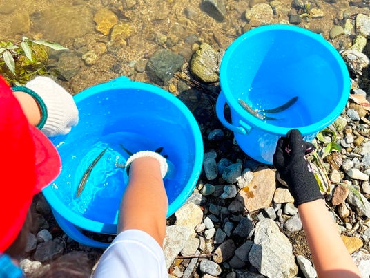 この日、揖保川漁業協同組合(兵庫県たつの市)から届けられた体長8~10cmほどのアユの稚魚、約3,000匹(約30kg)を、子どもたちがバケツに入れて一匹ずつ川へ放ちました。