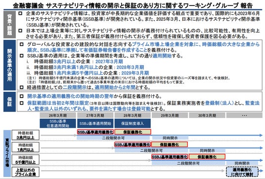 - 保証については、SSBJ基準の適用義務化が開始した時期の翌年から義務付けられます。保証範囲は、当初2年間は「Scope1・2排出量」「ガバナンス」「リスク管理」とされ、3年目以降は国際動向等を踏まえて今後検討される見込みです。