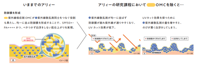 アリィーが目指す新たな商品設計にするためには、紫外線吸収剤メトキシケイヒ酸エチルヘキシル(以降 OMC と記載)を除く必要がありました。 OMCをただ除くだけでは、UV カット効果の低下や白浮き・伸びの悪さなど感触への影響が課題に。2022年、アリィーはその課題をクリアしました。