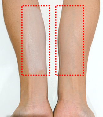 (写真 左右の腕に同量を塗布し、なじませた直後の比較 左:アリィーにおける従来技術の処方 右:アリィーにおける新技術でのビーチフレンドリー処方)