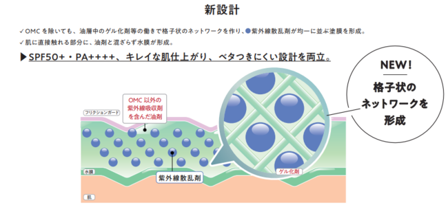 新処方は、OMC を除いても、油層中のゲル化剤等の働きで格子状のネットワークを作り、 紫外線散乱剤が均一に並ぶ塗膜を形成。 肌に直接触れる部分に、 油剤と混ざらず水膜が形成。SPF50+・PA++++、キレイな肌仕上がり、ベタつきにくい設計を両立しました。