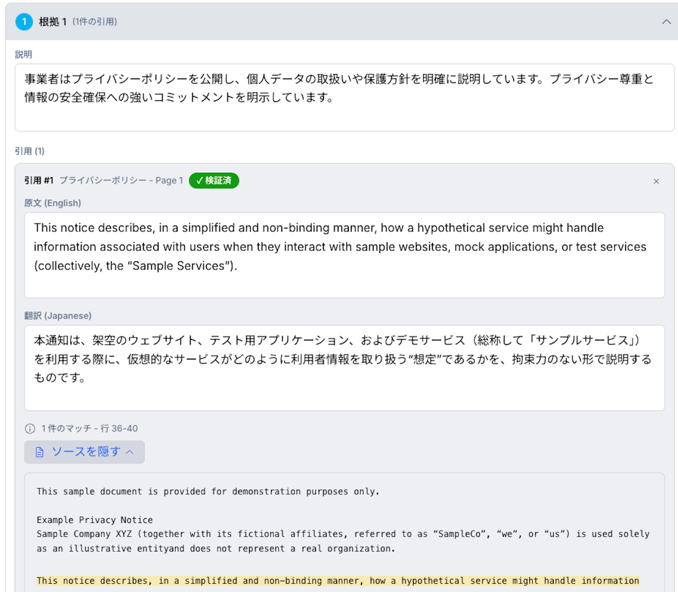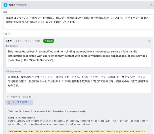 AIによる回答には、その根拠となる条文を必ずセットで表示します。提示される文章が実際の規約文書内に存在することを確認できる仕組みで、チェック担当者は情報の正確性を即座に確認できます。
