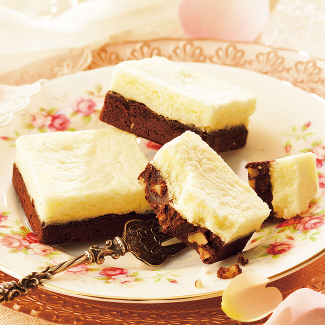 ジンで風味付けしたカカオの香り豊かな生地に、クルミを入れ、チーズチョコレートとクリームチーズなどを練り込んだ生地をのせて焼き上げました。ジンの香り、チーズの程よい酸味とクルミの香ばしさが、コクのあるチョコレートと相性ぴったりのおいしさです。