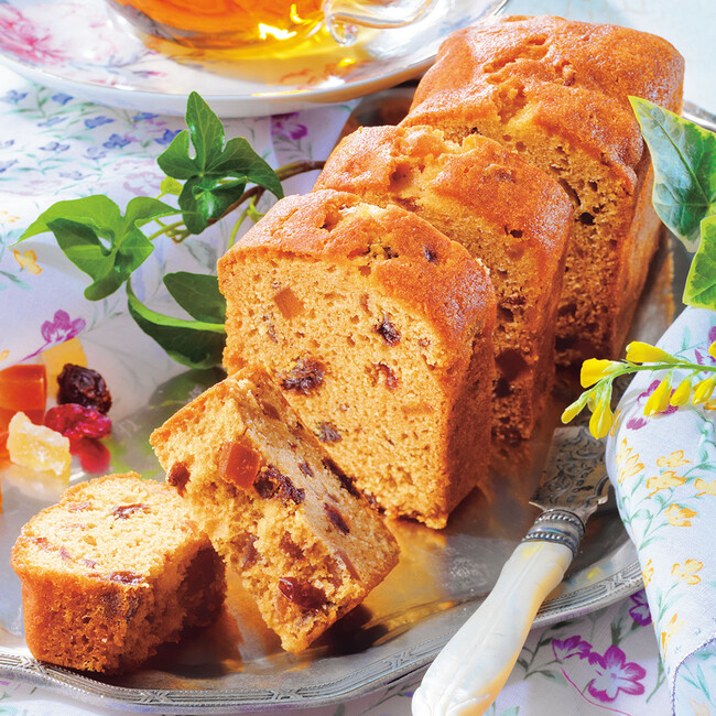 レモンと紅茶の風味を付けた生地に、紅茶が香るレーズン、クランベリー、パパイヤ、パイナップルを入れて焼き上げました。たくさんのフルーツと、仕上げにしみ込ませたエルダーフラワーのシロップが、甘酸っぱくさわやかに香ります。