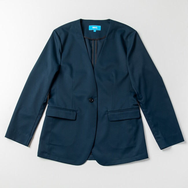 特 徴:教職員向けアイテムを提供するECサイト「センセイカプセル」とのコラボ商品。授業参観や面談でも使えて、固い印象になりすぎないノーカラージャケットは、肩パットがなくても肩の丸みが出にくいシルエットに仕上げました。黒板を書くなどの動作を想定し肩回りはゆとりを持たせ、背中とお尻が隠れる丈感にしました。