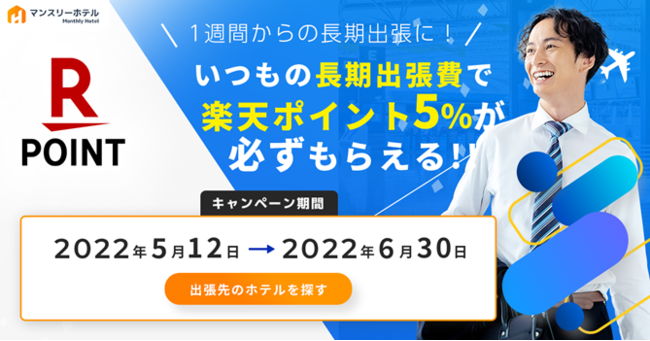 メトロエンジン株式会社(本社:東京都港区、代表取締役CEO:田中良介、以下メトロエンジン)と、BEENOS株式会社(東証プライム:3328)の連結子会社で、日本の魅力を世界に拡げ、インバウンド市場成長の加速を支援するBEENOS Travel(ビーノス トラベル)株式会社(代表取締役社長:竹内 拓、以下BEENOS Travel)が運営する、7泊以上の長期予約がリーズナブルな長期滞在専門予約サイト「Monthly Hotel(マンスリーホテル、URL:https://monthlyhotel.jp/)」は、本日よりマイページ機能を実装いたします。マイページ機能のリリースを記念し、楽天ポイントと連携したキャンペーンを実施、2022年5月12日(木)~6月30日(木)中に予約をし、チェックアウト後にアンケートにお答えいただいた方全員に宿泊料金の5%を楽天ポイントで還元いたします。