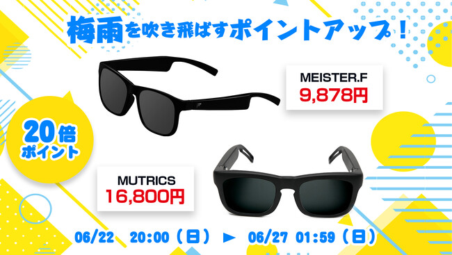 楽天「Show !t」は、6 月22日(木)から、周囲の環境音を聞きながら、音楽や通話・ナビが聞けるオーディオサングラスご購入でポイント20倍プレゼント。さらに6月22日(木)20時~6月27(火)01時59分まで全商品ポイント10倍プレゼント・送料無料になる楽天お買い物マラソンに参加します。