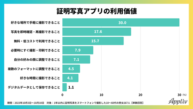 スマートフォンの証明写真アプリに価値を感じたことTOP3は、1位「好きな場所で手軽に撮影できること(30.0%)」、「写真を即時確認・再撮影できること(17.6%)」、「無料・低コストで利用できること(15.7%)」という結果でした。