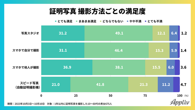 証明写真の仕上がりに対する満足度を撮影方法ごとに調べた結果、最も満足度が高かったのは「写真スタジオ」で、満足している人は80.3%、不満を感じた人は7.6%でした。