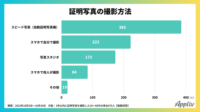 事前調査で証明写真を1年以内に撮影した回答した675人に、撮影方法を尋ねてみると、最も多いのが「スピード写真(自動証明写真機)(385人)」、次いで「スマホで自分で撮影(222人)」、「写真スタジオ(173人)」でした。