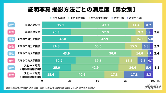 「スピード写真(自動証明写真機)」の場合、限られた時間内に自分が望むタイミングで撮影し自分好みに仕上げることは難しく、女性の不満の割合が多い理由なのではないでしょうか。