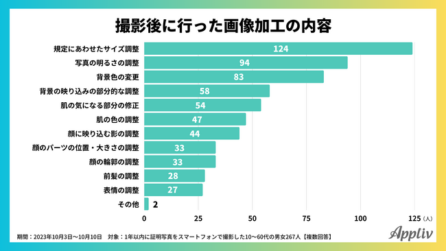 スマートフォンで撮影した写真を加工する際に行ったことを調査すると、「規定にあわせたサイズ調整(124人)」が最も多く、次いで「写真の明るさの調整(94人)」、「背景色の変更(83人)」でした。
