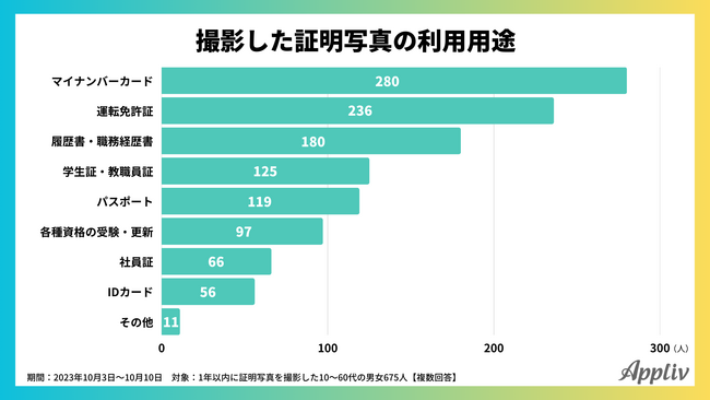 証明写真の利用用途を聞いたところ、「マイナンバーカード(280人)」が最も多く、次いで「運転免許証(236人)」、「履歴書・職務経歴書(180人)」という結果でした。