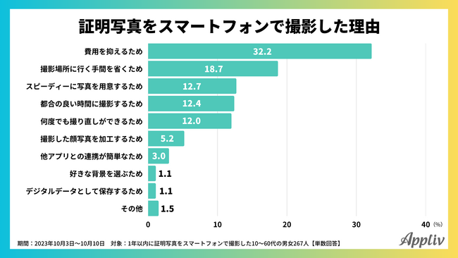 スマートフォンで証明写真を撮影した人に理由を聞いてみると、最も多いのは「費用を抑えるため(32.2%)」、次いで「撮影場所に行く手間を省くため(18.7%)」、「スピーディーに写真を用意するため(12.7%)」でした。