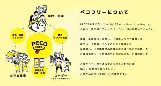 家庭環境の多様化により、子供のお弁当づくりは各家庭において大きな負担となっています。また、産業給食業界においては、食材費高騰や少子化による食数減少などの課題があり、学校給食の停止トラブルなど社会的な問題にも発展しています。PECOFREE社は双方を繋ぐプラットフォーマーとして、これらの社会課題の解決に貢献し、『PECOFREE(ペコフリー)』を通じた食による地域経済の活性化を目指しております。