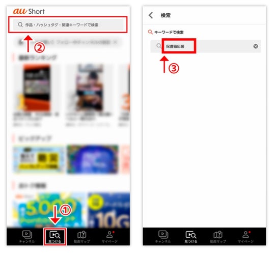 au Short内の下部にある『見つける』をタップし、画面上部の検索窓から、『保護猫応援』で検索