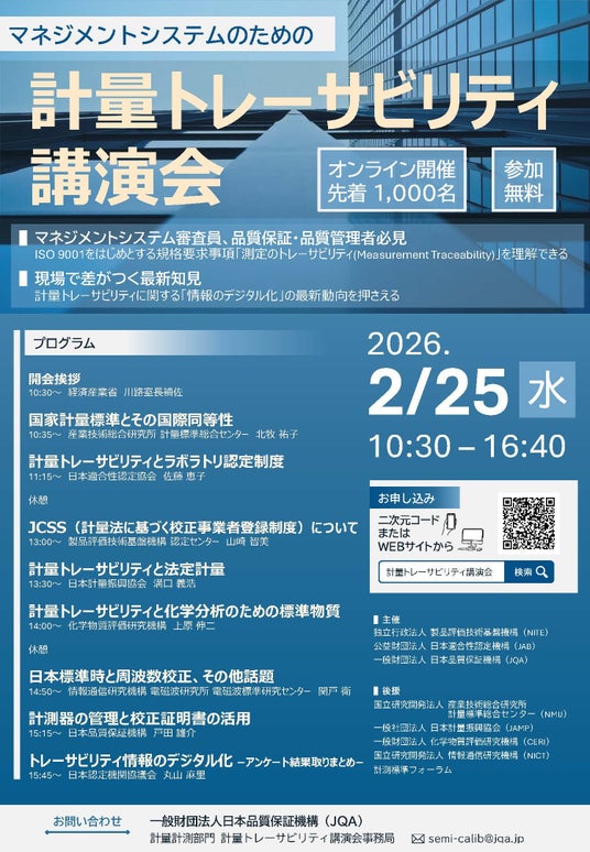 一般財団法人日本品質保証機構(本部:東京都千代田区、理事長:石井 裕晶)計量計測部門は、独立行政法人 製品評価技術基盤機構(NITE)および公益財団法人 日本適合性認定協会(JAB)との共催による無料WEB講演会「2025年度マネジメントシステムのための計量トレーサビリティ講演会」を、2026年2月25日(水)に開催いたします。