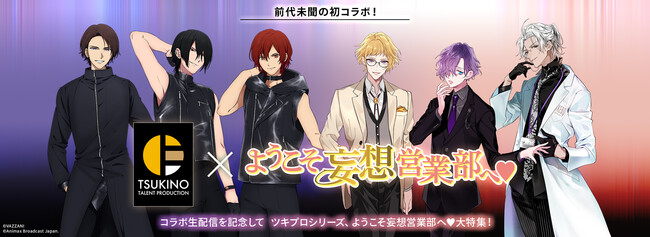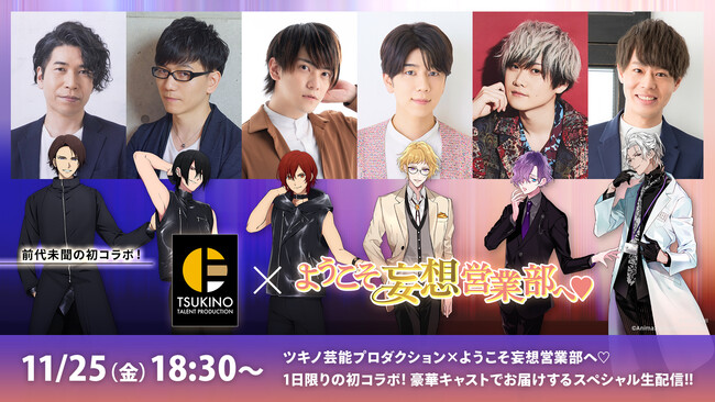 今年12月で10周年を迎える『ツキウタ。』など人気シリーズであるツキプロことツキノ芸能プロダクションのキャストと、観客の投票でスーツ姿の推しを操れる即興ドラマバラエティ『ようこそ妄想営業部へ♥』のキャストがアニメ専門チャンネル<アニマックスオンデマンド>で奇跡の初コラボ!アイドルと営業マンたちが繰り広げる、スペシャルコラボを11月25日(金)18:30から生配信!