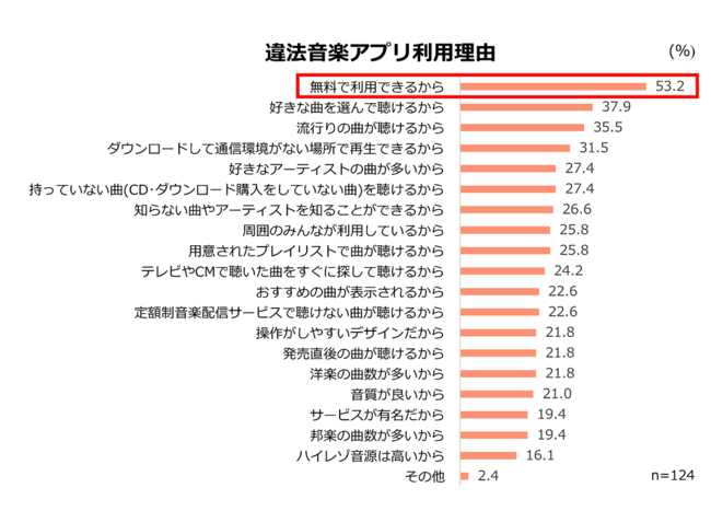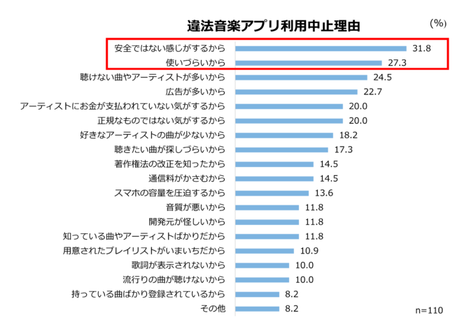 違法音楽アプリを利用する理由は「無料で利用できる」がトップ、中止理由は「安全ではない感じがする」「使いづらい」が上位に