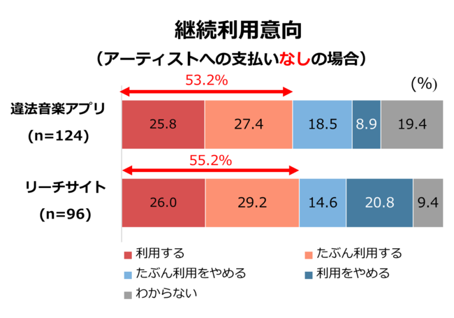 また、アーティストへの支払いがないと分かっても、違法音楽アプリ利用者の53.2%(昨年40.0%)、リーチサイト利用者の55.2%が利用を継続すると回答。アーティストが反対する場合の利用意向はそれぞれ39.5%と51.0%まで減少する。