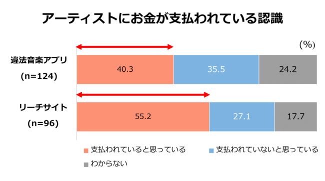 収益がアーティストに還元されているものと思い利用している違法音楽アプリ利用者は40.3%と前回調査(32.0%)から増加、一方リーチサイトでは55.2%と過半数を超える利用者がアーティストに還元されていると誤った認識で利用している。