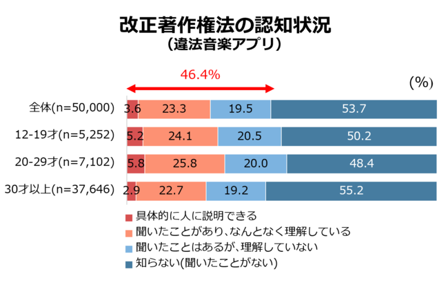 違法音楽アプリの規制強化を目的とする改正著作権法の認知率は昨年と横ばい
