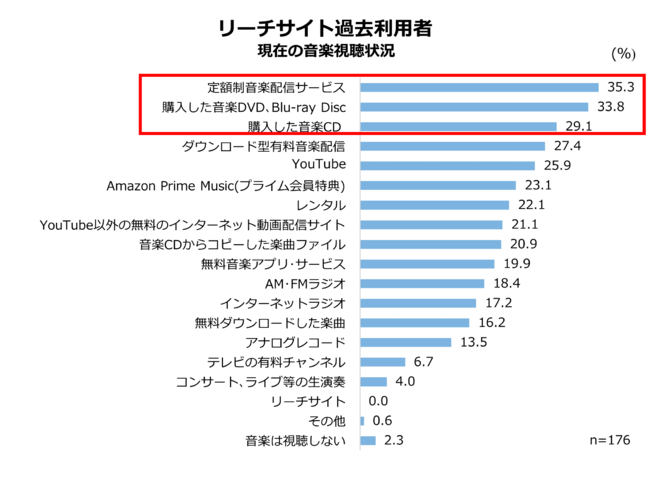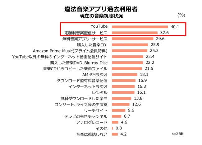 過去に違法音楽アプリを利用していたが、現在は利用を止めた人の音楽視聴方法では、「YouTube」「定額制音楽配信サービス」との回答が多く見られた。また同様に、リーチサイト過去利用者の現在の音楽視聴方法では、「定額制音楽配信サービス」がトップ、「購入した音楽DVD・Blu-ray Disc」、「購入した音楽CD」が続き、音楽関連商品を所有することに意欲的な傾向が見られた。
