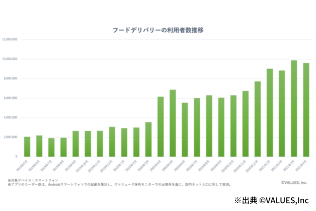 実際、主要5サービス(Uber Eats、出前館、楽天デリバリー、menu、dデリバリー)のアプリ利用者数は、2019年5月の200万人から、2021年3月までに約5倍の1000万人に迫る勢いで増加しており、デリバリー事業は今後も拡大していくことが予測されています。