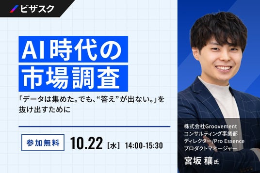 「知見と、挑戦をつなぐ」をミッションにグローバルなナレッジプラットフォームを運営する株式会社ビザスク(以下、当社)は、『AI 時代の市場調査』をテーマに、株式会社Groovement コンサルティング事業部 ディレクター/Pro Essence プロダクトマネージャー 宮坂 穰氏 ご登壇による無料オンラインセミナーを 10/22 (水) 14:00 より開催します。